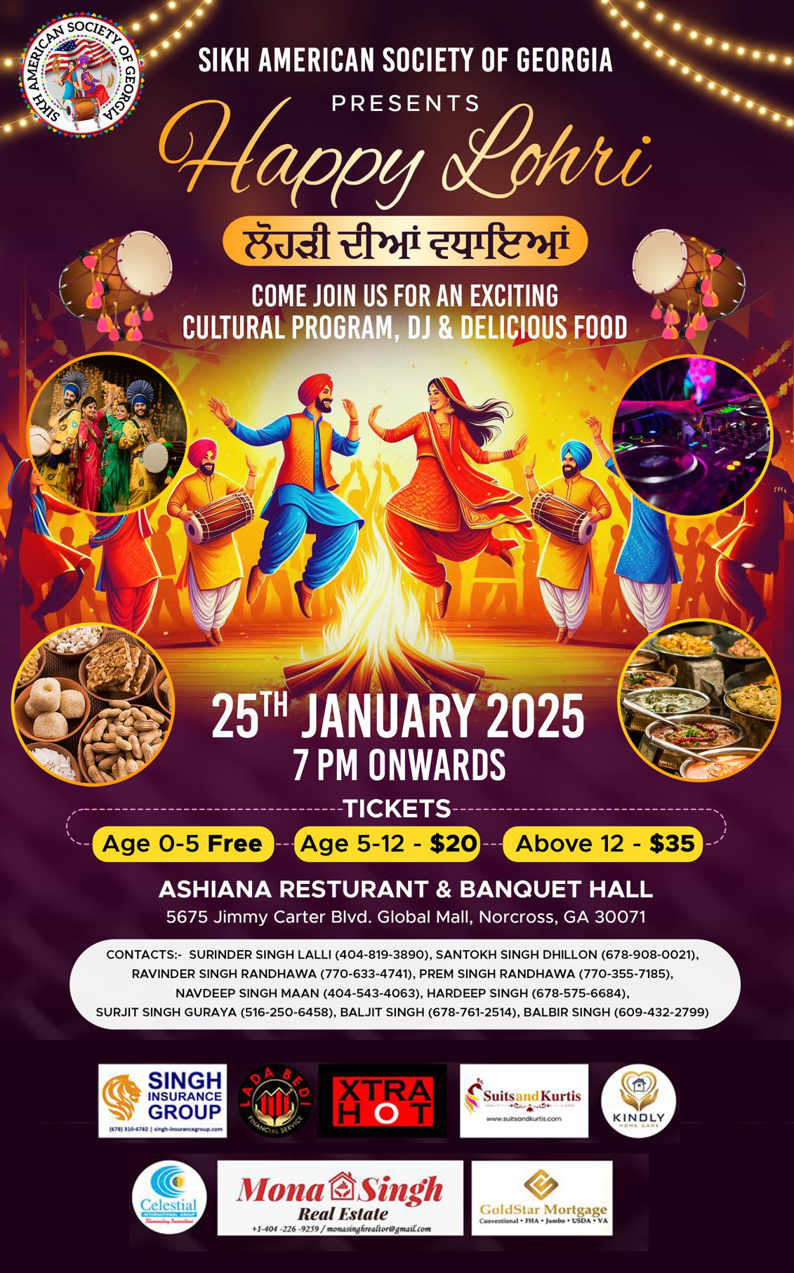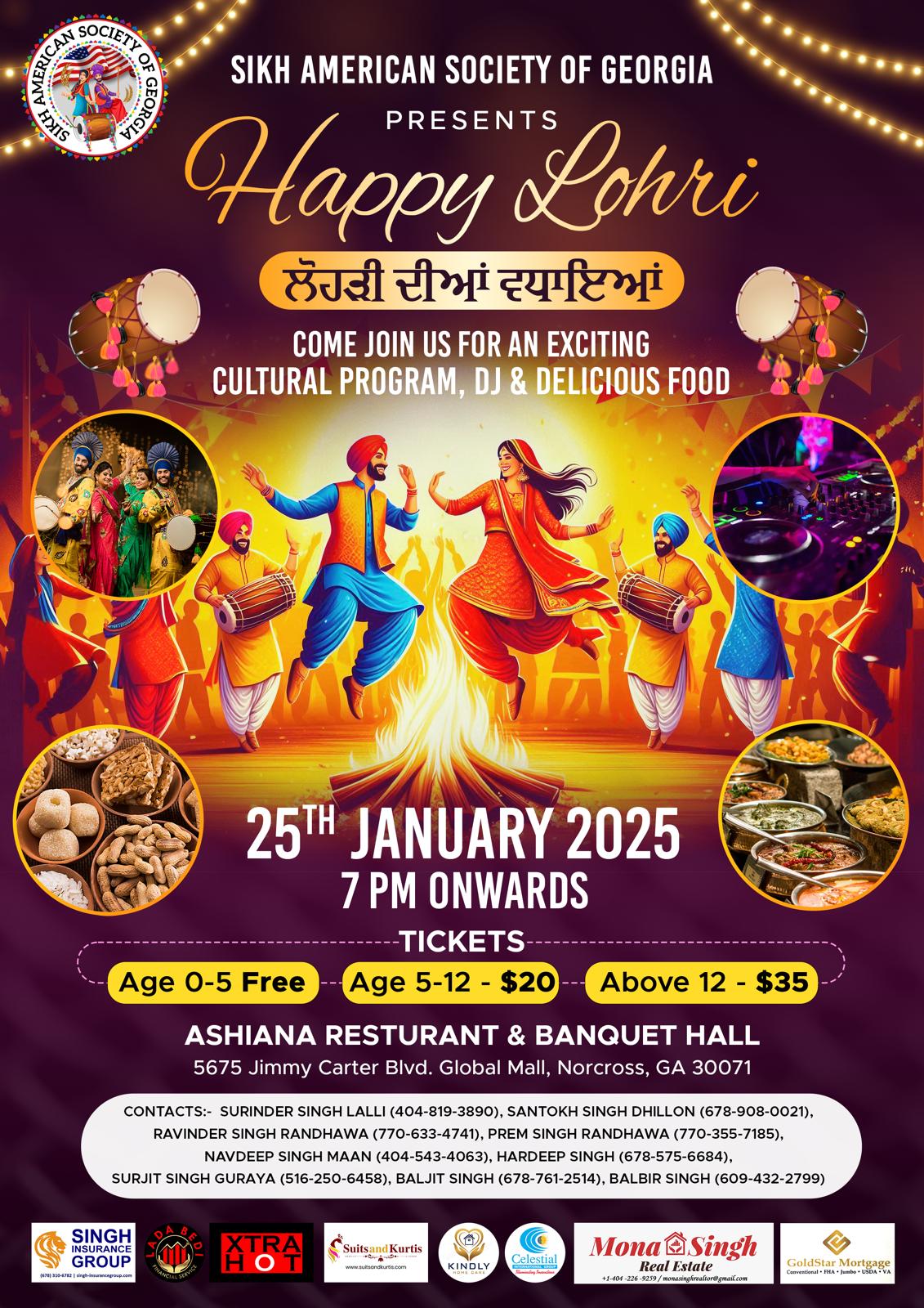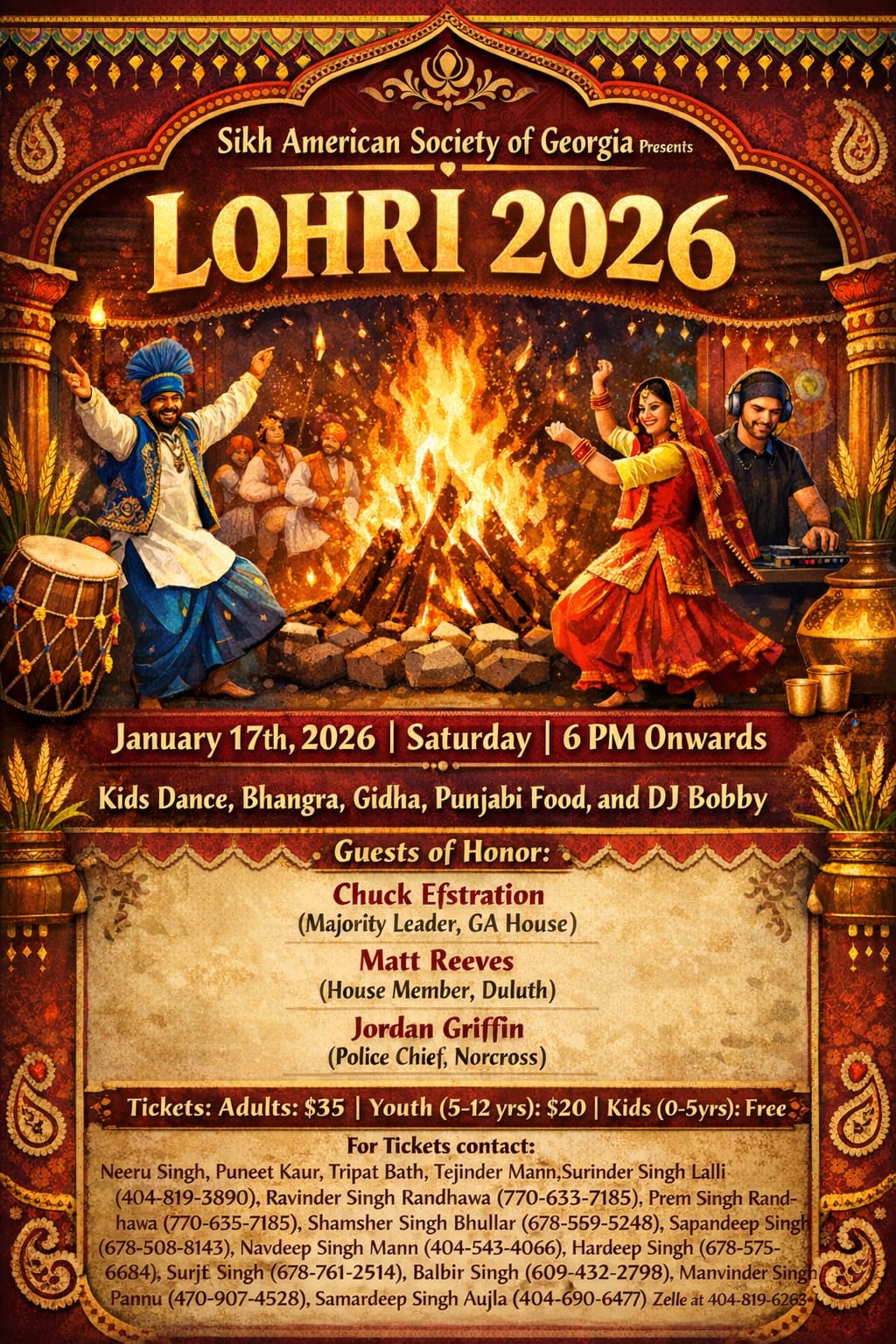 Join the Sikh American Society of Georgia (SASGA) for a grand Lohri celebration filled with vibrant cultural performances, a lively DJ, and delicious food!